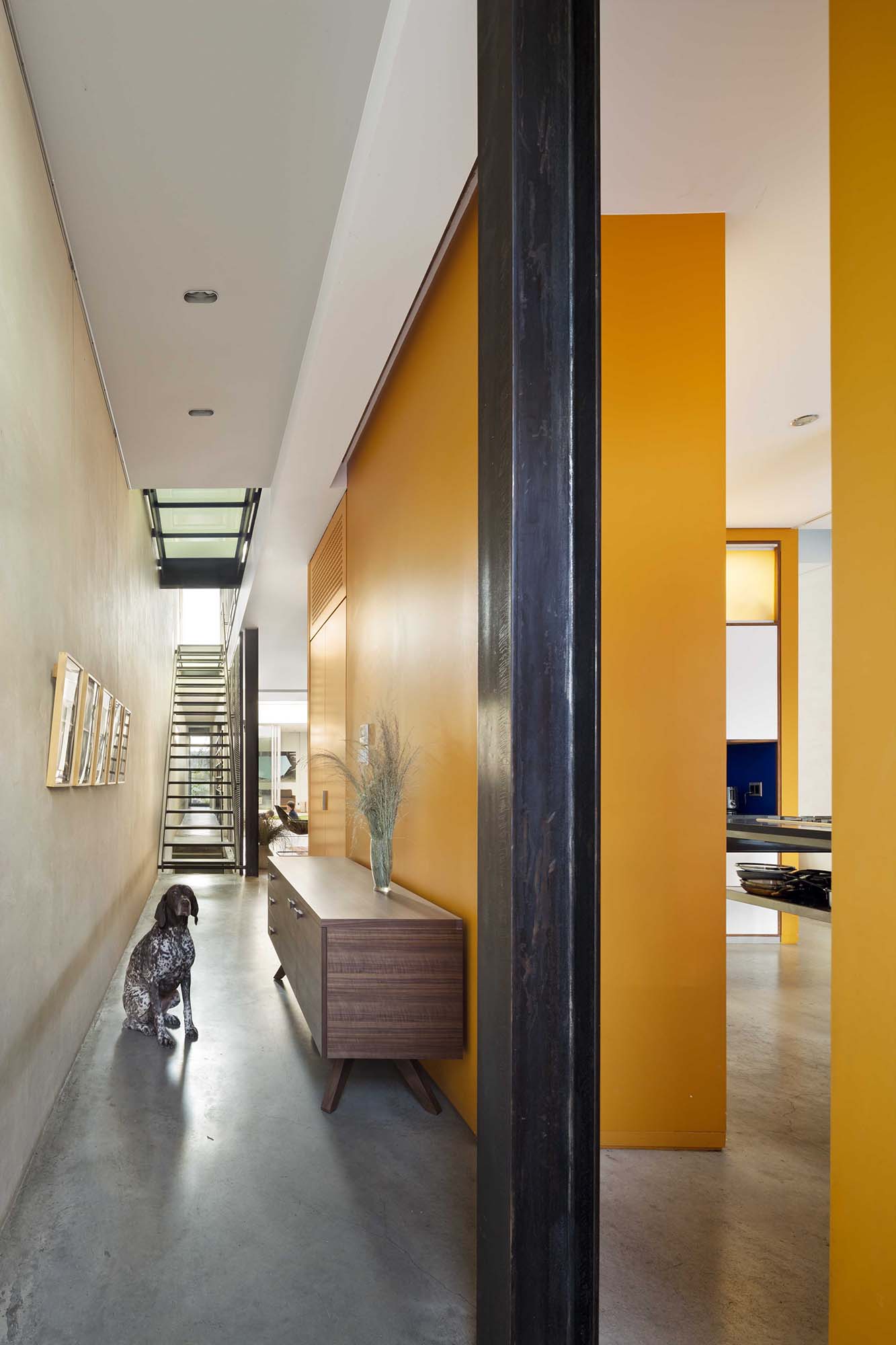 Sectional distinction between public and private spaces was accomplished by grouping all residential components on the second floor addition, and all common areas on the first, adjoining the open courtyard. Radiant floors, green roof, operable updraft skylights and a highly insulated envelope minimize the energy requirements of the building.