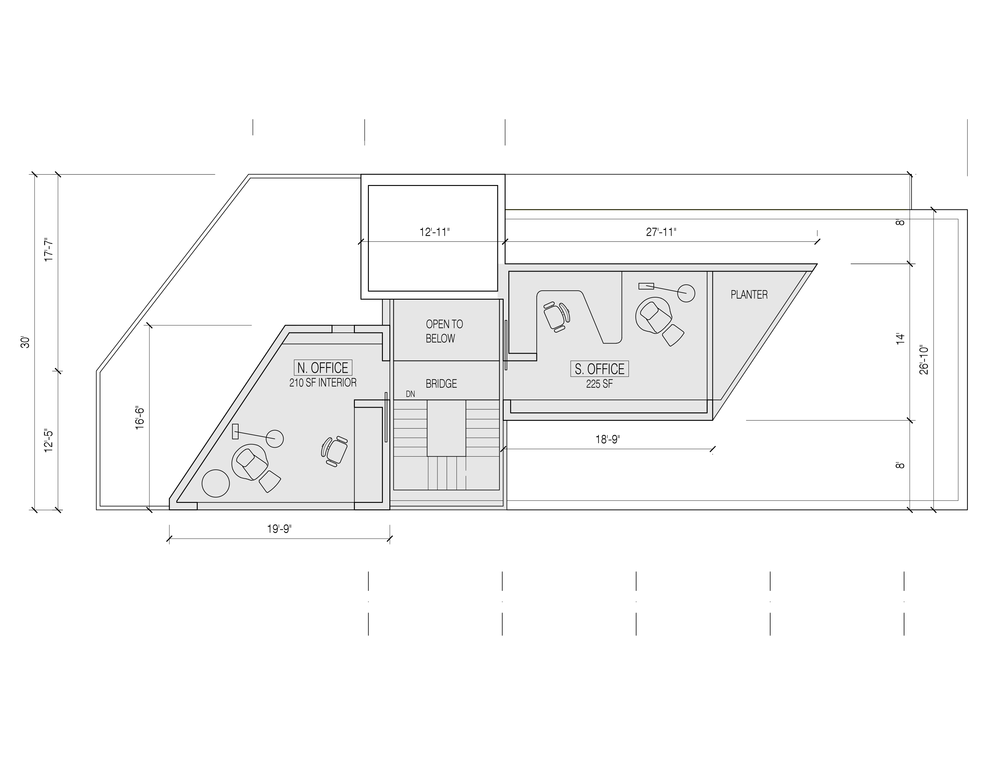This scheme imbeds itself into the existing roof to minimize its height and bulk from the street. The north office projects over the rear deck to maximize the zoning envelope and inflect the building mass to the rear. The offices arrange themselves around a glazed stair enclosure and a bridge spanning an opening that allows light and visual connection to the floor below.