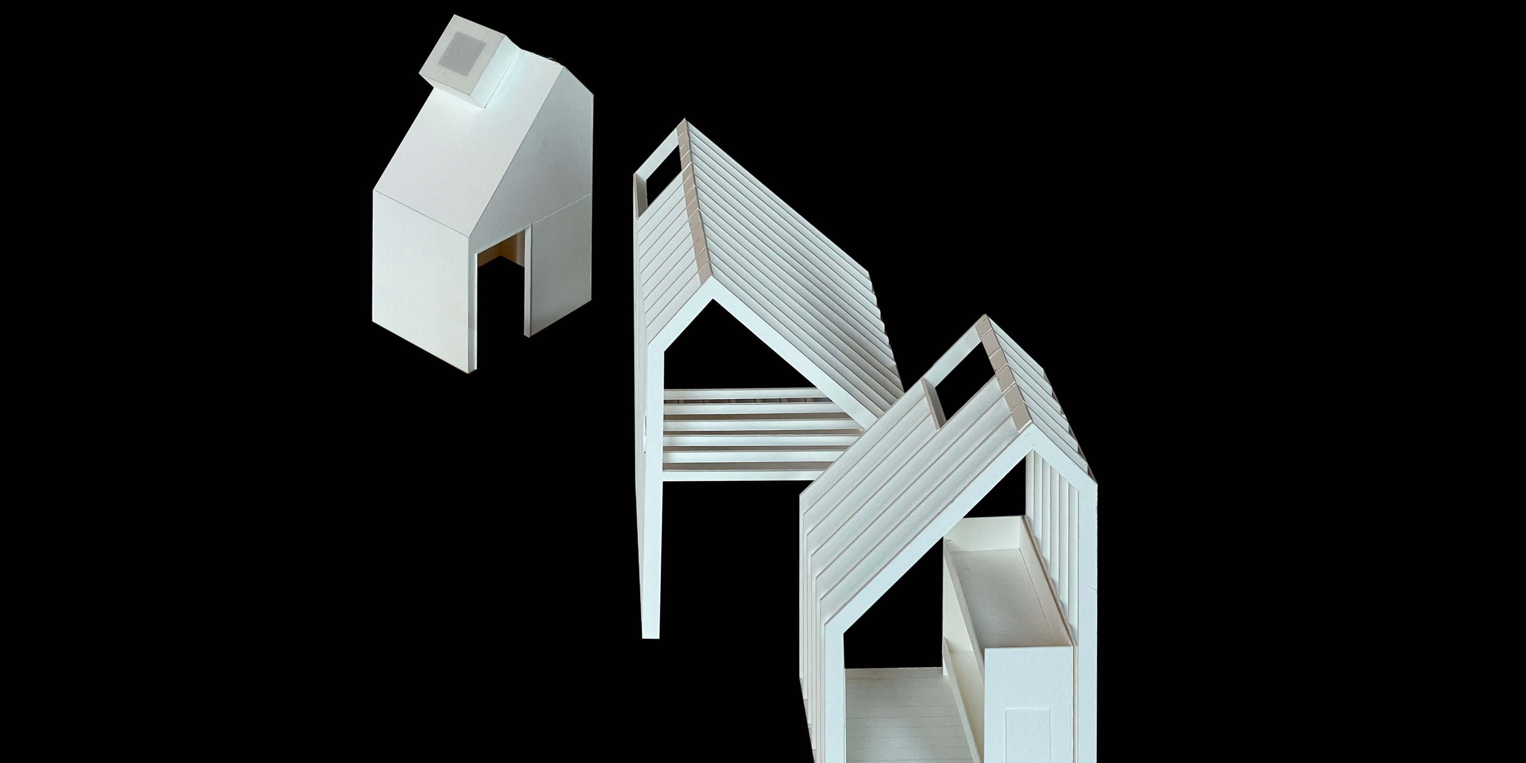 Skylights face north, building volumes shade and protect against prevailing winds.