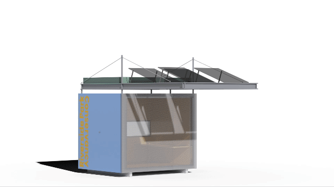 e/co_pod’s cantilevered roof is composed of two discrete sections: a green-blue roof and a photovoltaic array. The roof supports a wildflower intensive lawn that insulates the container from heat and collects rainwater in a 50-gallon reservoir used for irrigation. The solar array, inclined to the south for maximum efficiency, satisfies the energy requirements of climate control, lighting and computer charging of the e/co_pod users.